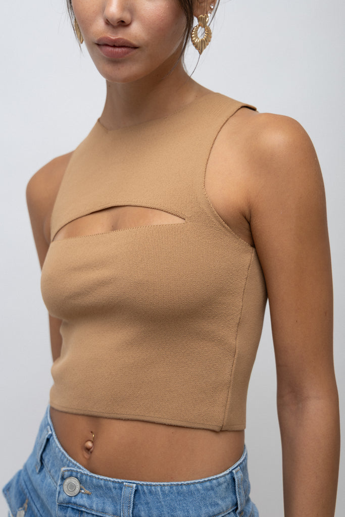 KNITTED CROPPED TOP – FRONT SLIT BROWN
